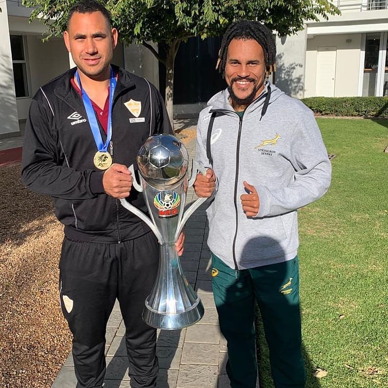 @Regrann from @blitzboks – Lots of smiles around @sas_hp today. Well done to @stellenbosch_fc for finishing top of NFD and being promoted to #AbsaPrem. We asked out our best soccer player to congratulate them! 😜. Also, if you want your line defended, ask @leelangeveldt or @davidsselvyn