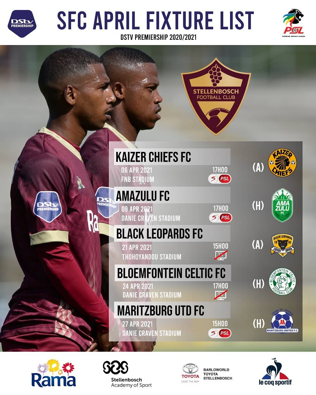 We’re into the business end of things. April rush of fixtures #StellenboschFC #ProudlyStellenbosch…