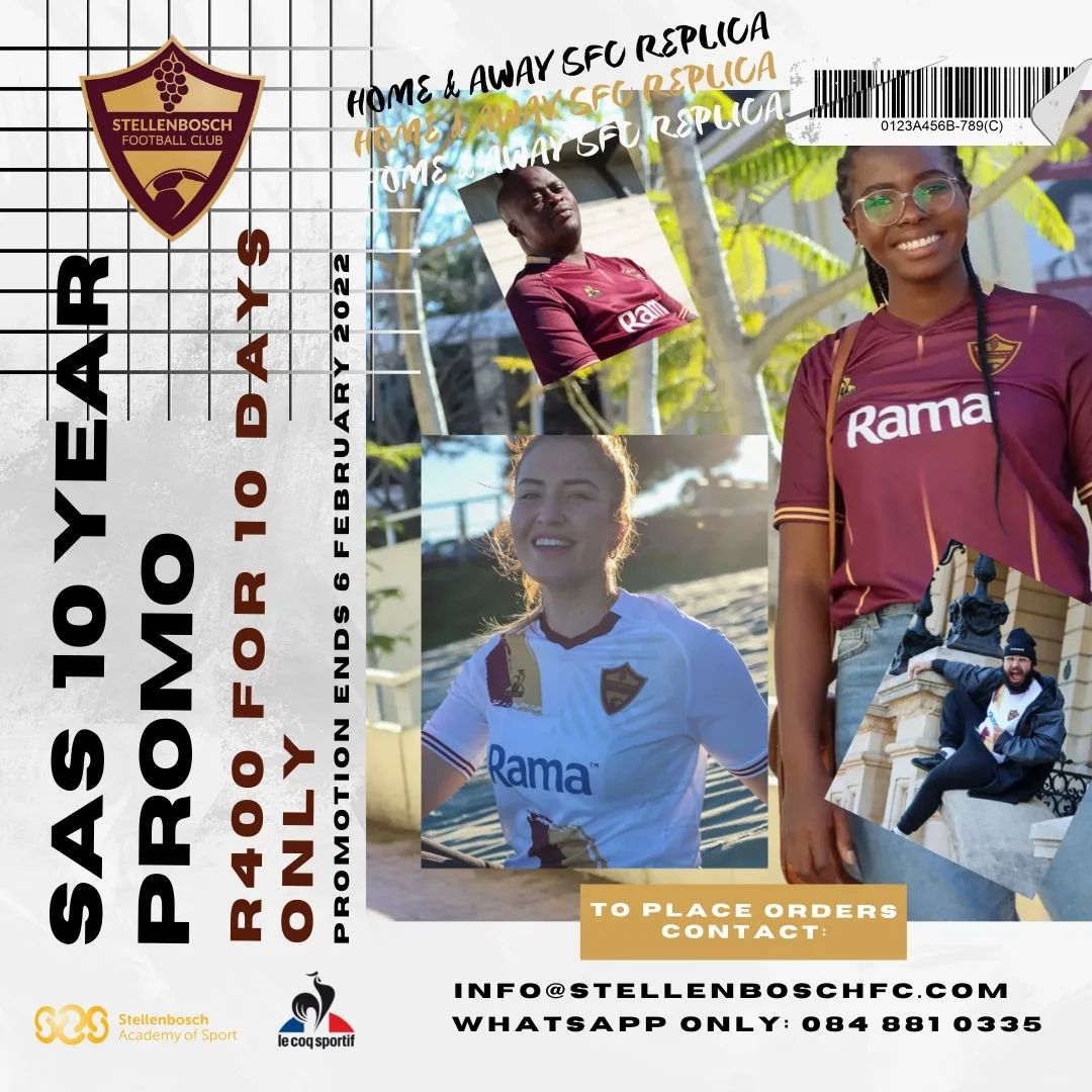 @stellenbosch_academy_of_sport 10 Year Celebrations continues with this season’s home/away SFC Replicas marked down to just R400 when you order between tomorrow and the 6th of February 2022!